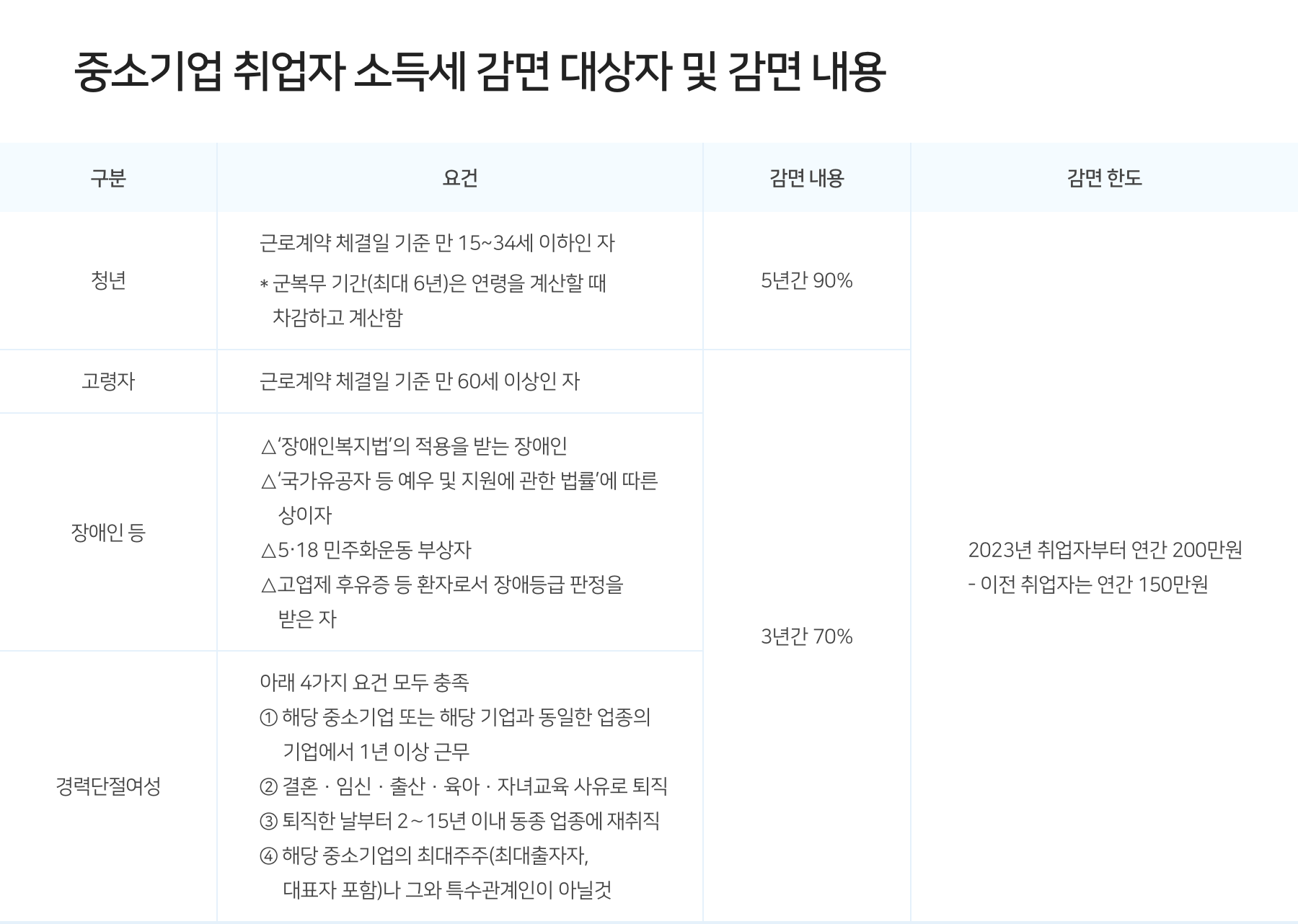 🔷 근로자는 취업한 회사가 감면 대상 중소기업에 해당하는지 여부 및 신청 절차 등 자세한 사항은 회사 측에 문의하시기 바랍니다.